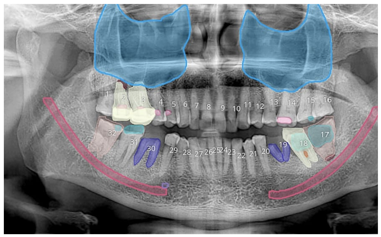 In OPG imaging, AI is applied at the screening and visualization level.